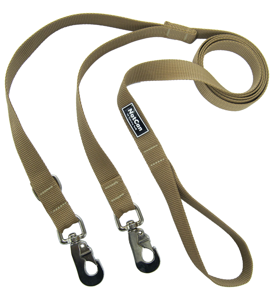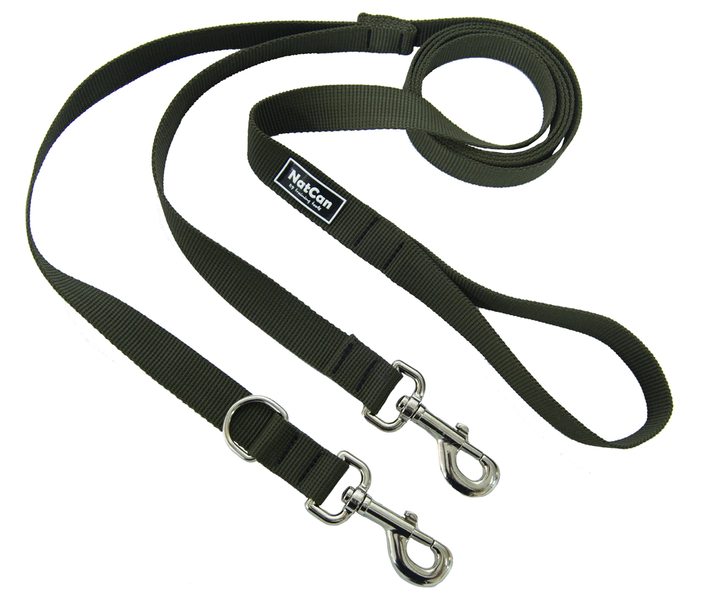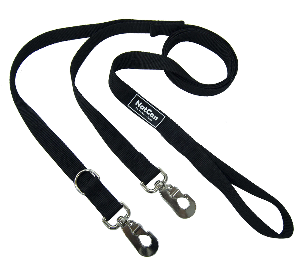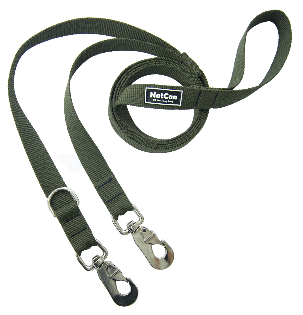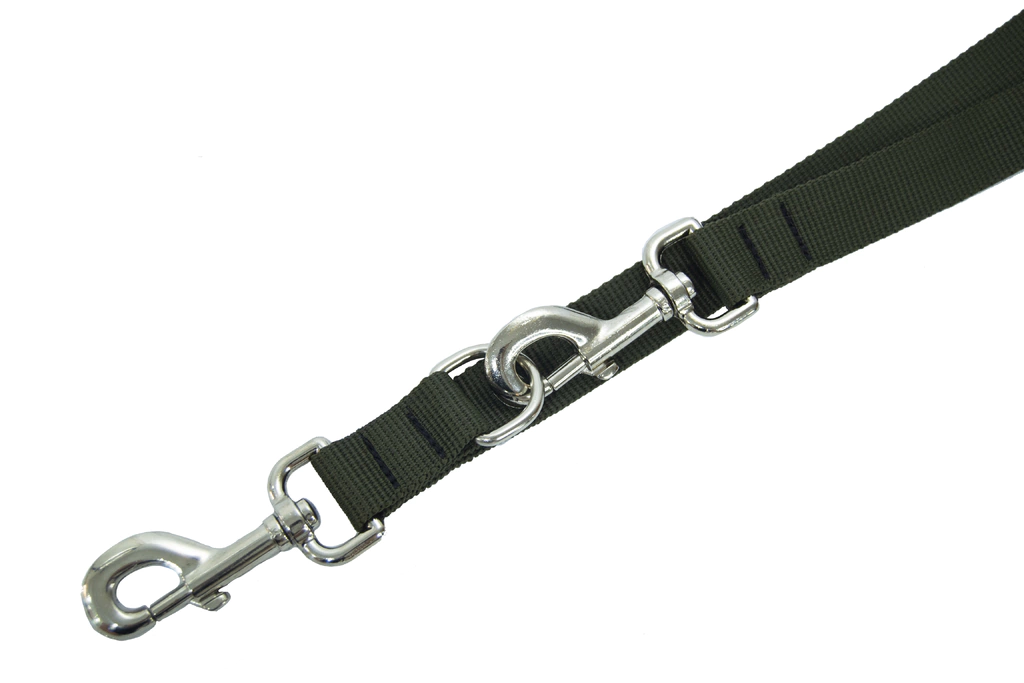 Enganchá un mosquetón al collar y el otro a un pretal, o usá ambos mosquetones en distintos collares.
