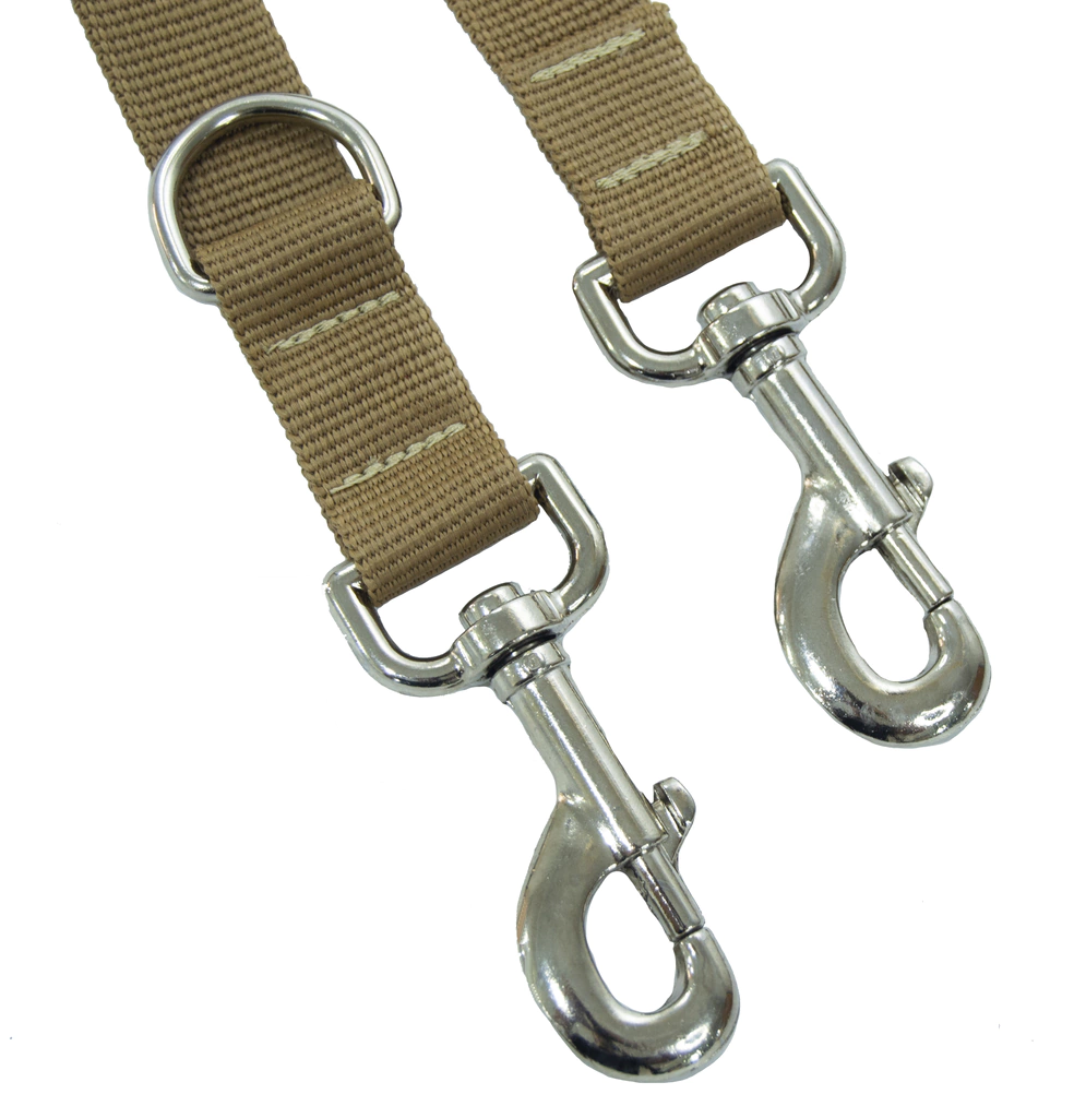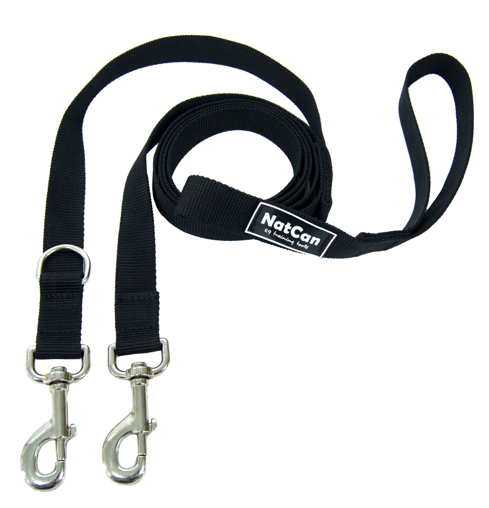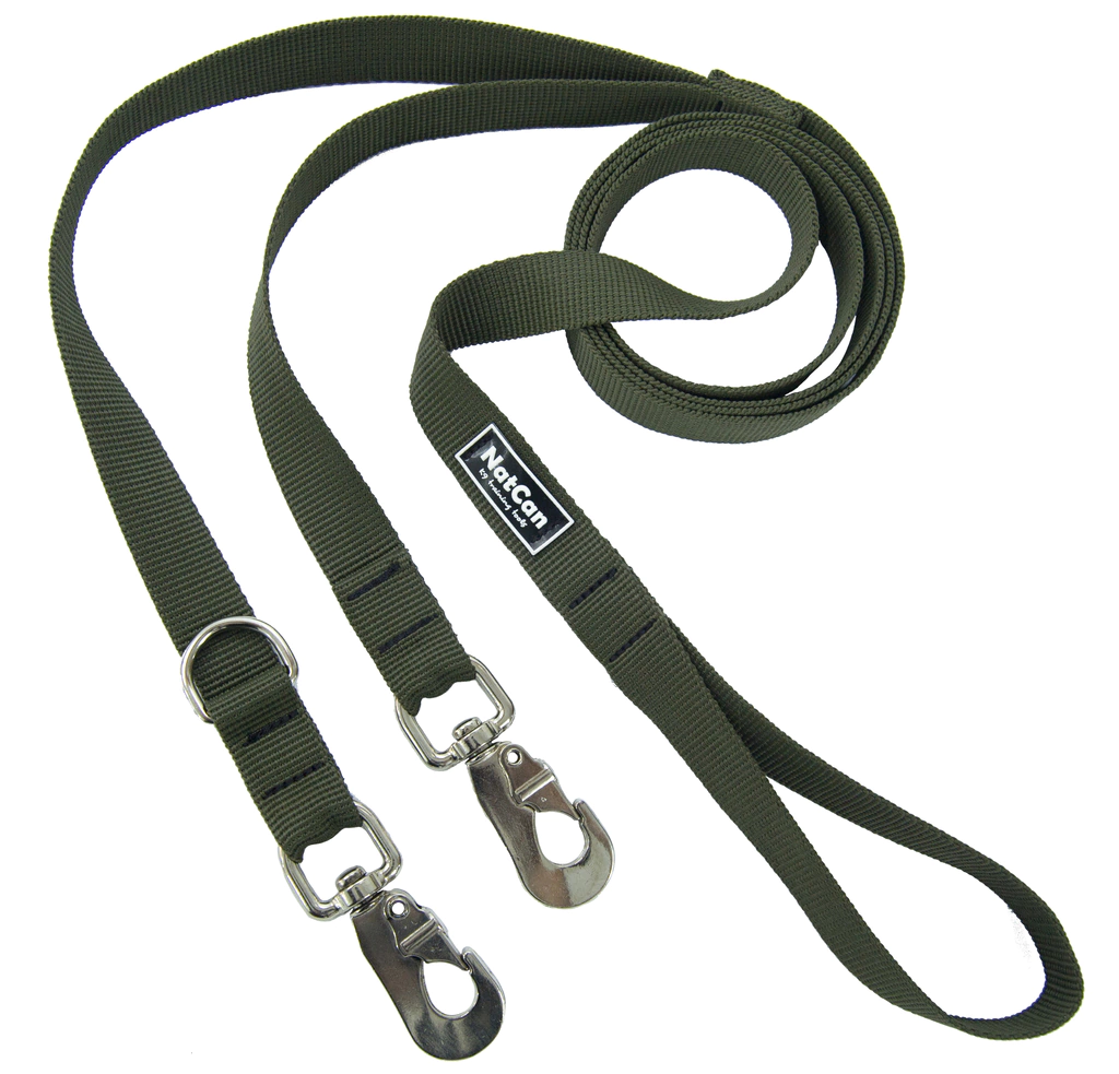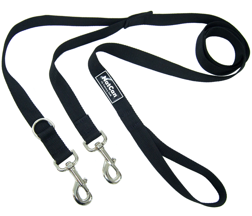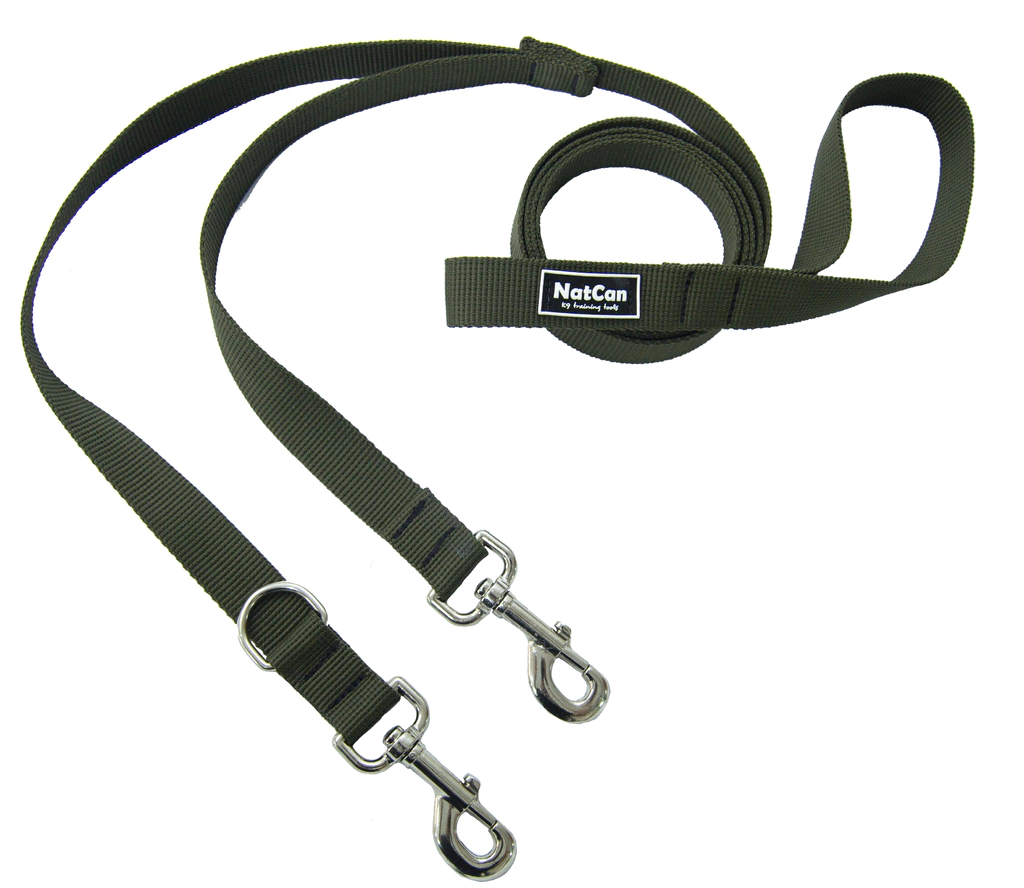 Enganchá un mosquetón al collar y el otro a un pretal, o usá ambos mosquetones en distintos collares.
