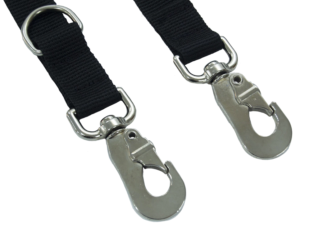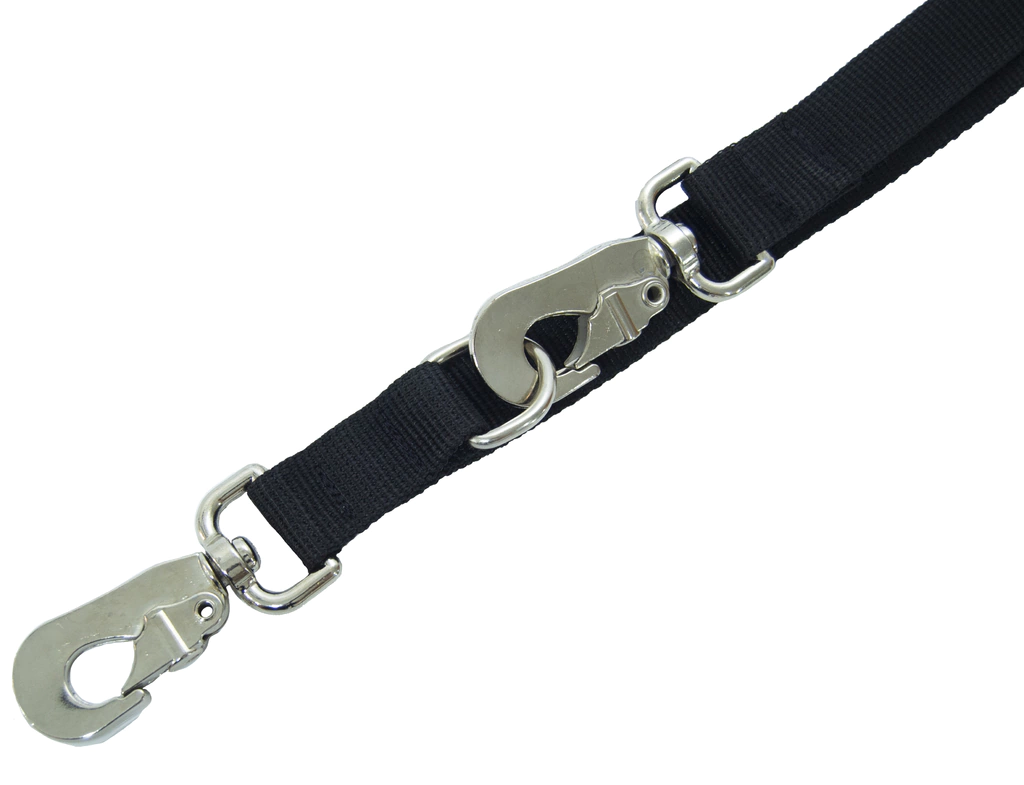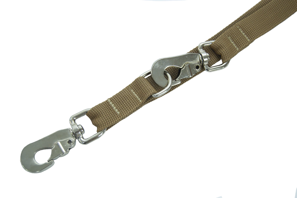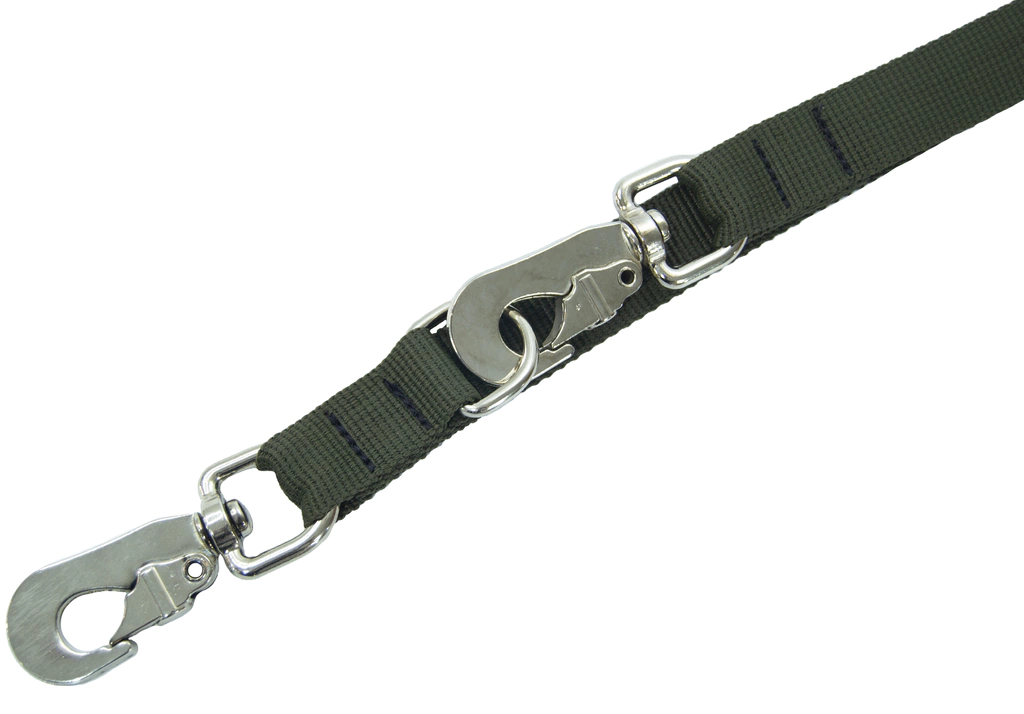 Correa con dos mosquetones reforzados y atraque industrial en las uniones.